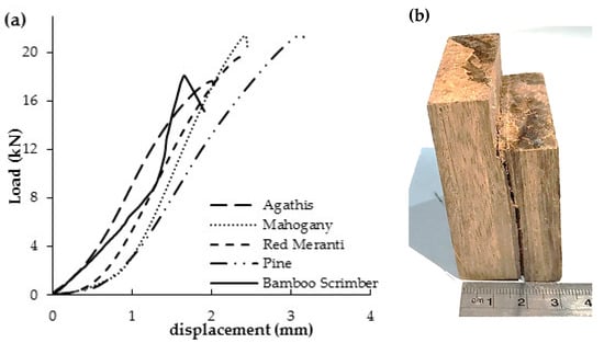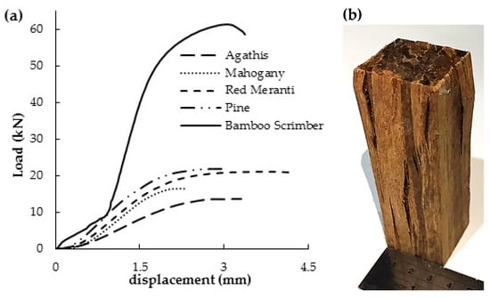 Figure 6a and Figure 7a show the load-displacement curves of the scrimber specimen under compression parallel- and perpendicular-to-fiber. Compared to the compression test parallel-to-fiber, all materials tested have a low compressive strength perpendicular-to-fiber. According to the load-displacement curve, the scrimber received twice the load with a similar displacement before failure to other materials tested. Therefore, scrimber has a higher compressive strength perpendicular and parallel-to-fiber than timber. The failure mode in compression parallel-to-fiber was buckling (Figure 6b).