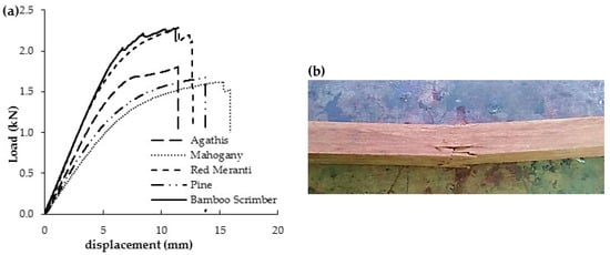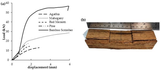 The mean values for elastic and rupture modulus of timber are 6.97–11.00 GPa and 52.08–72.42 MPa. Red meranti had the highest value for elastic and rupture modulus of all specimens tested. Figure 9a shows the load-displacement curve of scrimber under flexural test. It shows that the scrimber specimen has reached maximum load with a relatively small displacement compared to other materials tested.