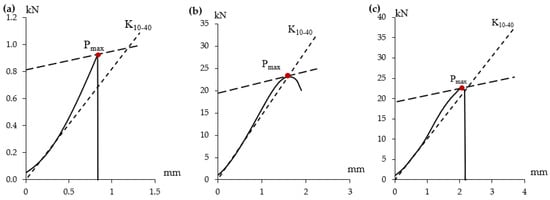 - European Committee for Standardization (CEN) [55]: This method uses the secant and tangent lines of the two parts of the load-deformation curve to determine the yield point. The first line indicates the initial stiffness, calculated from 10% to 40% of the maximum load. The angle between the secant line and displacement axis is α. The slope of the second line is equivalent to one-sixth (1/6) of the slope of the second of the load-displacement curve. The yield point is resolved as the intersection of the first and second lines (Figure 2c).
