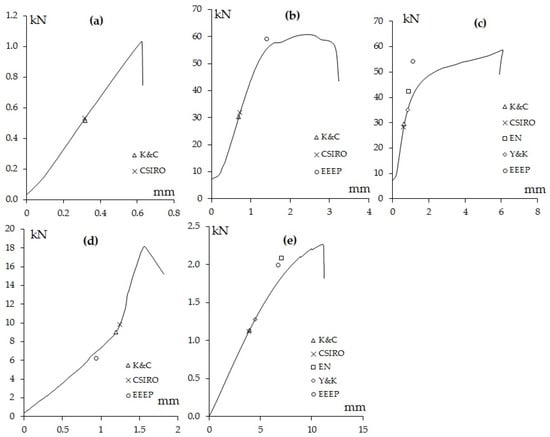 - Muñoz, W.; Salenikovich, A.; Mohammad, M.; Quenneville, P. Determination of yield point and ductility of timber assemblies: In search for a harmonised approach. In Proceedings of the 10th World Conference on Timber Engineering 2008, Miyazaki, Japan, 2–5 June 2008. [Google Scholar]