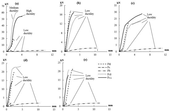 Ductility expresses the ratio between ultimate displacement (Δu) and yield displacement (Δy) (Equation (2)). The Δu and Δy are commonly obtained from tensile and compressive tests. However, this study measured ductility ratio (μ) through several mechanical property tests (i.e., tension parallel-to-fiber, compression parallel-to-fiber, compression perpendicular-to-fiber, shear parallel-to-fiber, and bending).