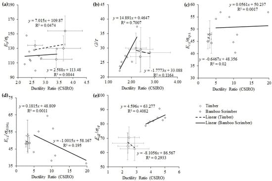 Generally, the lowest ductility ratio of all mechanical properties tested was found in the tension parallel-to-fiber test. In contrast, the highest ductility ratio was found in the bending test for timber and compression parallel to the fiber of bamboo scrimber. In the bending test, the specimen will undergo deflection before the specimen failure. While in the tension parallel-to-fiber test, the specimen had little or no deflection and immediately reached failure. The same behavior was also found in the CLT connection studied by Ceallaigh and Harte [75], that shear forces are more ductile than tensile. For connection subjected to a shearing force, significant deformation occurs before failure occurs after the yield point. Connections in tension forces are less ductile than in shear forces, and the load will drop significantly after reaching the maximum load. Similar behavior is also found in this study, shown in Figure 5a. The ductility behavior of bamboo scrimber in compression perpendicular-to-fiber can be categorized as high. Meanwhile, the ductility behavior in compression parallel-to-fiber is medium. However, bamboo scrimber subjected to bending, tension, and shear is low ductility or brittle. Smith and Asiz [76] concluded that typical range responses for components in structural timber systems illustrated in Jorissen and Fragiacomo’s [70] report are brittle for tension and bending members and ductile for compression both parallel and perpendicular-to-fiber.