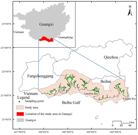 The Beibu Gulf is located in southern China (20°54′–21°24′ N, 107°56′–109°47′ E; Figure 1). The coastline extends westward from the Ximi Estuary (at Yingluo Port) at the junction of the Hepu and Lianjiang counties (Guangdong Province), to the Beilun Estuary at the junction of Dongxing City and Vietnam. The total length of the coastline is 1628.59 km. The coastline is tortuous and has many natural bays, including the Tieshan, Lianzhou, Qinzhou, and Fangcheng bays, as well as Pearl Harbor [1]. This region is characterized by a marginal tropical marine climate, with an annual rainfall of 1500–2000 mm and an average annual temperature of 22.0–23.4 °C. The Beibu Gulf has a relatively extensive mangrove distribution, with rich mangrove wetland resources, and contains the Shankou, Beilun Estuary, and Maoweihai mangrove nature reserves. The Beibu Gulf also contains a National Wetland Park. The dominant mangrove species include A. marina, Aegiceras corniculatum, K. obovata, B. gymnorrhiza, R. stylosa, and A. ilicifolius, with the top five mangrove communities (based on area) comprising A. marina, A. corniculatum, A. marina + A. corniculatum, B. gymnorrhiza + A. marina, and R. stylosa. The A. marina and A. corniculatum communities account for 41.74% and 32.91% of the total mangrove area, respectively [6].