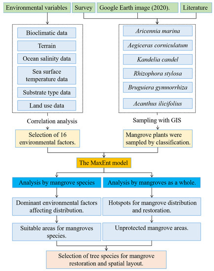 To predict suitable mangrove species distributions using the MaxEnt model, species distributions and environmental data are required. Mangrove distribution data for the Beibu Gulf were visually interpreted according to the 2020 Google Earth images (0.61–2.4 m resolution). The appearances of the various mangrove plants in the 2020 Google Earth images differed (Table 1). The crowns of R. stylosa were nearly round or round, the leaves were dark green, and the heights of the trees were greater than those of A. marina and K. obovata, resulting in dark shadows around the trees. R. stylosa was observed as independent patches on the map [32]. B. gymnorrhiza was distributed as a single plant with a nearly round or round blue-green crown. When an uncertain mangrove species was observed, we performed field surveys to verify the species. Additional data were obtained from previous studies, and 908 data points from a mangrove forest survey were provided by the Guangxi Mangrove Research Center. In the study area, re-adoption work was conducted using the fishing net tool in the ArcGIS 10.4 software package (Environmental Systems Research Institute, Redlands, CA, USA), supplemented by manual marking, from which a 300 m × 300 m grid was established. A total of 2270 sampling and coordinate data points were obtained in the study area. Among them, the 1076, 999, 98, 34, 28, and 35 sampling points were for A. corniculatum, A. marina, K. obovata, B. gymnorrhiza, R. stylosa, and A. ilicifolius, respectively. The sampling sizes had no obvious influence on MaxEnt [33]. Longitude and latitude data for the species distributions were extracted using the “Calculate Geometry” tool in ArcGIS 10.4 and data were stored as comma-separated value files to form a mangrove sample dataset. We used an analytical framework to predict the potential mangrove species distributions (Figure 2).