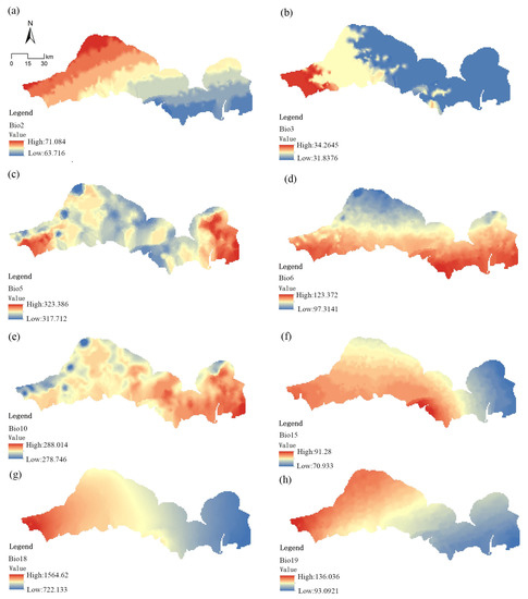 Environment variable. (a) Bio2, (b) Bio3, (c) Bio5, (d) Bio6, (e) Bio10, (f) Bio15, (g) Bio18, (h) Bio19.