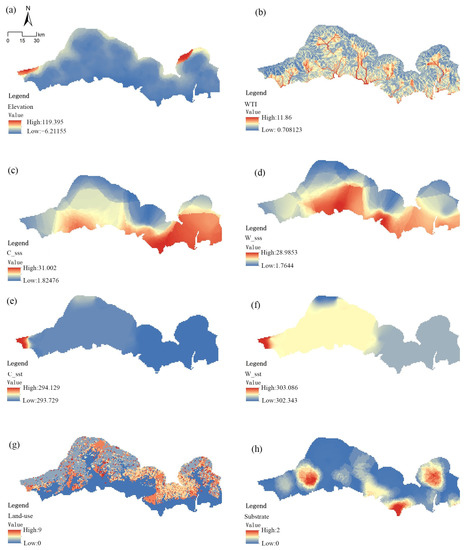 Environment variables. (a) Elevation, (b) WTI, (c) C_sss, (d) W_sss, (e) C_sst, (f) W_sst. (g) Land-use, (h) Substrate.