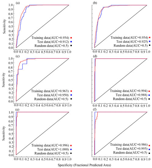 The receiver operating characteristic (ROC) curves of the mangrove species used to verify the MaxEnt model. (a) A. marina (b) A. corniculatum (c) K. obovata (d) B. gymnorrhiza (e) R. stylosa (f) A. ilicifolius.