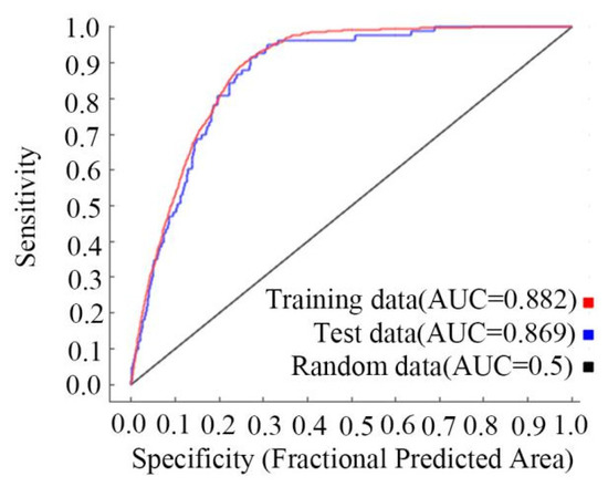 The AUC values of the training and test sets of the predictive model for the six mangrove species in the Beibu Gulf ranged from 0.912 to 1 (Figure 5), whereas those for all mangrove species combined were 0.882 and 0.869 for the training and test sets, respectively (Figure 6). Based on the AUC values of the test set, the MaxEnt model simulation of the mangroves was deemed accurate. Thus, the model was highly reliable and could predict the distribution of the dominant mangrove species in the Beibu Gulf.