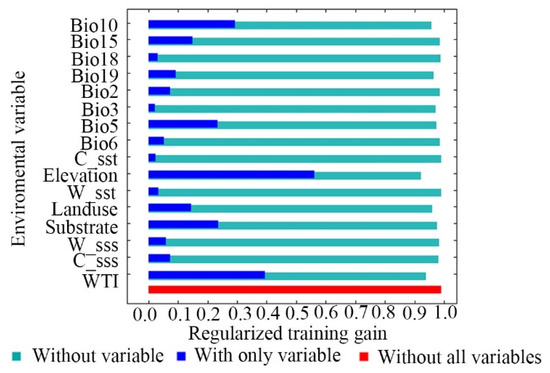 The regularized training gains of the combined mangrove distribution. Dark blue entries represent independent test results of each variable, light green entries represent test results excluding the variable, and red entries represent test results including all variables [40]. The length of each entry represents the size of its score (i.e., longer entries indicate more important variables).