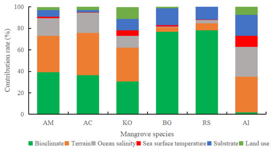 The most important factor that affected the overall distribution of mangroves in the Beibu Gulf was topography, followed by bioclimatic factors, land use type, sea surface salinity, and substrate type. The SST had relatively weak effects on the overall distribution. Among the mangrove species, R. stylosa and B. gymnorrhiza were more sensitive to bioclimatic factors than the other four species.