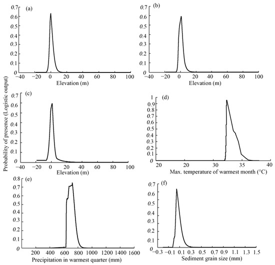 The response curves of environmental variables for (a) A. marina, (b) A. corniculatum, (c) K. obovata, (d) B. gymnorrhiza, (e) R. stylosa, and (f) A. ilicifolius (entry definitions are the same as in Figure 5).