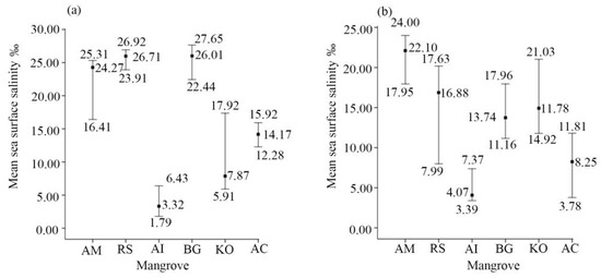 Salinity preferences of the different mangrove species in the coldest and warmest seasons. Mean sea surface salinity in the (a) coldest and (b) warmest seasons.