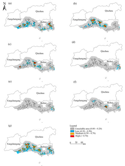 According to the findings of Hu et al. [28], we divided the potential mangrove areas based on their suitability as follows: best (>0.7), medium (0.7–0.5), low (0.2–0.5), and unsuitable (0–0.2). Using the six mangrove species as the overall inputs for the model (Figure 12g), we obtained an optimal suitable area of 13,816 hm2. The best fitness areas were located primarily in the Dandou Sea on the western side of the Shatian Peninsula in southeastern Hepu County, Guangxi; Tieshan Harbor in Qinzhou Bay and the Dafeng River in the center of the Guangxi coastline; Fangcheng Bay on the western Guangxi coastline; and the Shankou Mangrove National Nature Reserve (Figure 13g).