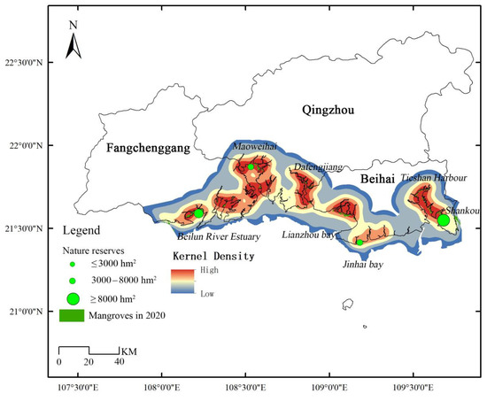 Based on the mangrove habitat suitability results, priority areas for mangrove protection and restoration (potential mangrove hot spots) were calculated using the kernel density estimation (KDE), which is a hot spot spatial analysis method [39]. The distribution of discrete values in continuous space can be obtained by calculating the densities of the elements in their surrounding neighborhood. In this study, after the KDE analysis was performed in the ArcGIS software, we used a spatial superposition analysis of the mangrove distribution status, priority area spatial distributions, and nature reserve distributions to further analyze the protection status of the mangrove ecosystem in the Beibu Gulf. The protected area information, including the protection rate and the protection and repair of vacant areas, was also obtained from the spatial superposition analysis.
