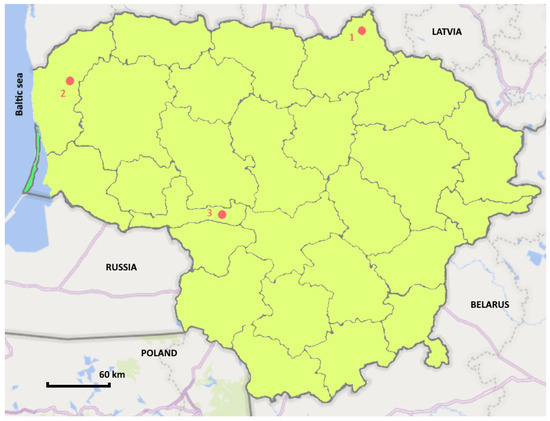 Map showing the sites in Lithuania, where wood samples were collected. Location: 1. Biržai Regional Division (RD), 2. Kretinga RD, 3. Raseiniai RD.
