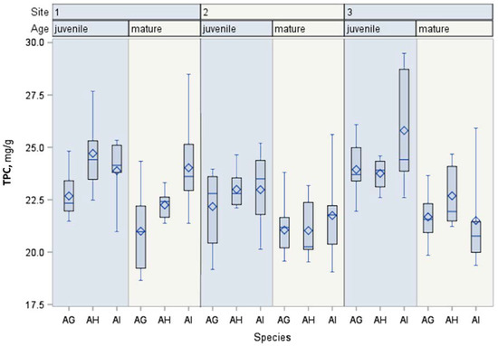 In this study, we found that the TPC in mature alder wood were lower by about 6.8%, compared to young trees (p < 0.01) (Table 2). The content of TPC in the wood of the hybrid alder were closer to those of the grey alder. The TPC varied statistically significantly depending on the species, age and location of the alder (p < 0.0001). The interaction between alder species, location and age affected the differences in TPC (p < 0.0001).