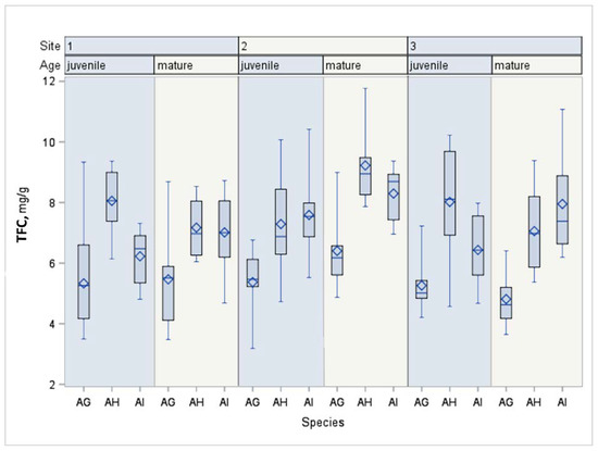 This paper provides the results of the identification of the TPC and TFC of A. incana, A. glutinosa and their hybrids via wood extracts (Table 2). During the experiment, the differences between these biologically active compounds were assessed according to alder species, age and location. Our results showed strong statistically significant differences of TPC and TFC concentrations between alder species (p < 0.0001). The results indicated that A. glutinosa has a significantly lower concentration of TPC compared to A. incana and alder hybrids. The TPC concentration of alder hybrids was intermediate between A. incana and A. glutinosa. Most researchers suggest that hybrids are intermediate compared to parental species with respect to the concentration of secondary compounds [15,16,43,44,45,46]. However, other researches indicated that the concentrations of biochemical compounds can be similar [43,45,47], lower [43,48] or higher [46,49,50] in hybrid species compared to parental species. In our case, TPC showed no significant differences between the studied species of alder.
