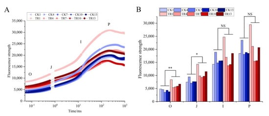 Effect of PWN on rapid chlorophyll fluorescence induction kinetic curves of P. thunbergii needles. (A) The trend of OJIP curves. (B) Analysis of the differences between O, J, I, and P points. CK1, CK4, CK7, CK10, and CK13 indicate day 1, day 4, day 7, day 10, and day 13 after inoculation in the control group (CK), whereas TR1, TR4, TR7, TR10, and TR13 indicate day 1, day 4, day 7, day 10, and day 13 after inoculation in the treatment group (TR). * p < 0.05, ** p < 0.01, and NS: not significant using the Duncan’s multiple range test.