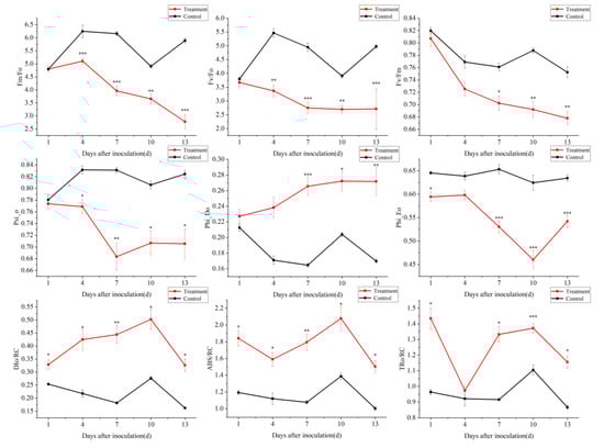 Analysis of chlorophyll fluorescence parameters of P. thunbergii needles under PWN stress. * p < 0.05, ** p < 0.01, *** p < 0.001 using Duncan’s multiple range test.