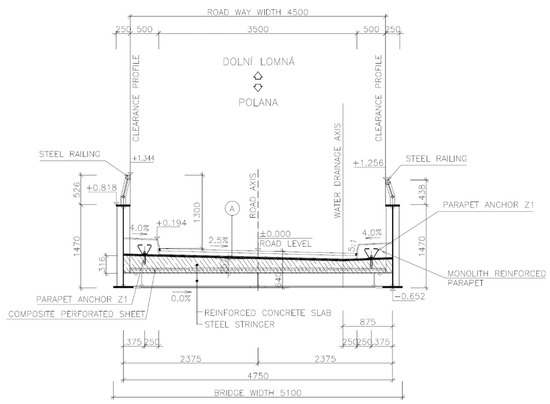 The main beams were designed as welded I profiles with a height of 1.47 m with both-side column bracing. The mutual axial distance of the beams is 4.75 m. The beams are interconnected in the bottom part by an oblique end and perpendicular intermediate crossbeams at a distance of 1.5 m. The bottom bridge deck is made of a system of longitudinal beams and cross beams. Crossbeams with a span of 4.75 m were designed from cold-rolled profile HEB 260 and carry internal longitudinal beams, which are also designed from cold-rolled profiles HEB 260 at a mutual distance of 1.50 m. For the structural coupling of the reinforced concrete slab of the bridge deck with steel structure, perforated coupling strips made of the structural steel with a yield strength of 355 MPa were welded to the upper flanges of the bridge deck steel crossbeams. The properties of the steel used are specified in the European standard [30]. A railing with vertical infill made of structural steel with a yield strength of 235 MPa (S235) was welded to the upper flange of the main load-bearing beams. The load-bearing steel beams were composed of structural steel with a yield strength of 355 MPa (S355). The bridge deck slab was designed as monolithic reinforced concrete, 4.736 m wide and 13.06 long. The thickness of the slab is variable. The minimum slab thickness is 200 mm. The slab is designed from reinforced concrete C30/37, and it supports the roadway. The crossbeams and reinforced concrete slab are connected in the roadway part. Coupling was realized by means of the coupling strip made of 12 mm thick sheet steel, which is perforated with a diameter of 30 mm holes and welded to the upper flange of the crossbeams by a T-filled weld. The bottom primary load-bearing reinforcement of the concrete slab was passed through the holes at the coupling strip. The roadway structure on the bridge comprises asphalt concrete with a thickness of 40 mm, connecting spray, coated medium grain aggregates, 35 mm thick mastic asphalt, and NAIP insulation on the sealing layer. On both sides of the bridge, monolithic parapets are composed of reinforced concrete with strength class C30/37 with resistance to corrosion induced by chlorides and with the resistance to alternate freeze and thaw attacks. The monolithic parapets are 618 mm wide. On both sides of the bridge, a 1.30 m high railing is designed with a vertical infill made of structural steel, which is anchored to the parapet via anchor plates by means of glued anchors.