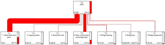 Table 2. WCB environmental damage (Pt), midpoint categories, SimaPro, IMPACT 2002+: 1. Abutments and piers, 2. Capping beam, 3. Abutment wall, 4. Main construction and bridge deck, 5. Bridge bearing, 6. Bridge top, 7. Bridge equipment.