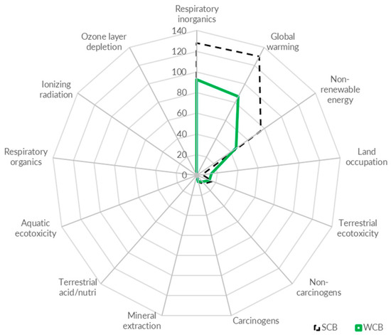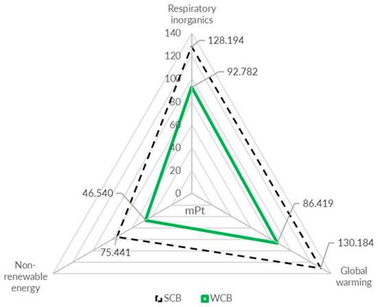 Figure 8. Comparison of WCB and SCB environmental damage (mPt) per m2 (SimaPro, IMPACT 2002+, midpoint categories).