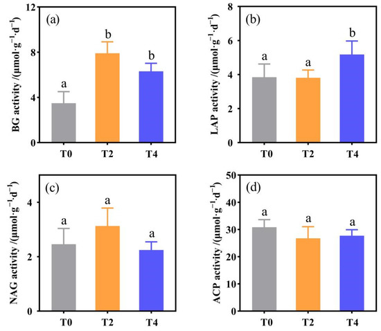 Changes in soil enzyme activities under different treatments: (a) the activity of BG (β-1,4-glucosidase); (b) the activity of NAG (β-1,4-N-acetylglucosidase); (c) the activity of LAP (L-leucine aminopeptidase); (d) the activity of ACP (acid phosphatase). T0: control without warming; T2: 2 °C warming treatment; T4: 4 °C warming treatment. Lowercase letters represent significant differences in soil enzyme activity under different treatments (p < 0.05).