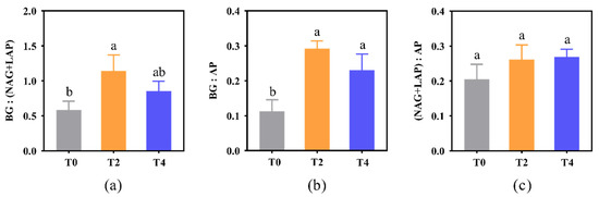 Changes in soil enzymatic stoichiometry under different treatments. (a) ratio of C metabolizing enzyme to N metabolizing enzymes; (b) ratio of C metabolizing enzyme to P metabolizing enzyme; (c) ratio of N metabolizing enzymes to P metabolizing enzyme. BG: β-1,4-glucosidase; NAG: β-1,4-N-acetylglucosidase; LAP: L-leucine aminopeptidase; ACP: acid phosphatase. T0: control without warming; T2: 2 °C warming treatment; T4: 4 °C warming treatment. Lowercase letters represent significant differences in soil enzyme activity under different treatments (p < 0.05).
