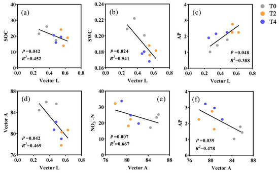 The results of correlation analysis further showed that SOC, SWC, and microbial P limitation were significantly negatively correlated with microbial C limitation (p < 0.05, Figure 3a,b,d). AP was positively correlated with microbial C limitation (p < 0.05, Figure 3c). Furthermore, AP and NO3−-N were significantly negatively correlated with microbial P limitation (p < 0.05, Figure 3e,f).