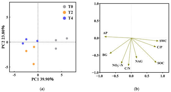 Principal component analysis (PCA) of soil and enzyme activity factors under different treatments. T0: control without warming; T2: 2 °C warming treatment; T4: 4 °C warming treatment. (a) Different colors represent different treatments, the farther the distance between points represents the greater the sample difference; (b) According to the quality of variables in principal component analysis, eight variables with greater contribution were selected.