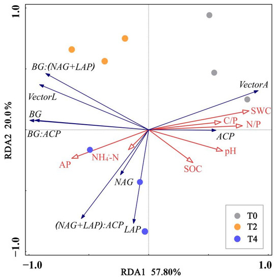 Redundancy analysis (RDA) of soil properties, soil enzyme activities, and microbial C, P limitation. T0: control without warming; T2: 2 °C warming treatment; T4: 4 °C warming treatment. SWC: soil water content; SOC: soil organic carbon; NH4+-N: ammonium nitrogen; AP: available phosphorus; C/P: SOC/TP; N/P: TN/TP; BG: β-1,4-glucosidase; NAG: β-1,4-N-acetylglucosidase; LAP: L-leucine aminopeptidase; ACP: acid phosphatase.