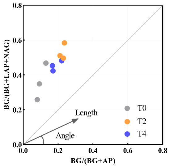 Based on the vector theory of enzyme chemistry proposed by Moorhead et al. [18,23], vector length (vector L) and vector angle (vector A) calculated by enzyme stoichiometric ratio were used in this study. Soil microbial nutrient limitation was analyzed by calculating vector length (vector L) and vector angle (vector A) of all data: