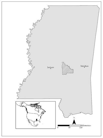 The BNF is located in central Mississippi between Jackson and Meridian (Figure 1). The proclamation area of the BNF is 157,150 ha with approximately 72,000 ha managed by the United States Forest Service. It is intersected by multiple state highways and county roads as well as U.S. Highway 80 and Interstate 20; within the proclamation boundary there are multiple land uses (farms, home sites, etc.) in privately owned lands. Pine (Pinus spp.) species dominate the forested areas of the BNF. The region is classified as Humid-subtropical with an average annual high temperature of 24.3 °C, average annual low temperature of 10.9 °C, and averages 157.2 cm of precipitation per year (mostly in the form of rain).