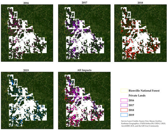 Using multiple image sources, this study tracked an outbreak of SPB and treatment response in the BNF in central Mississippi. Utilizing high-resolution imagery allowed identifying infested groups of trees and the consequent areas of standing dead timber and/or treatments and removals. While manual classification can be utilized to identify areas for mechanical treatment and suppression efforts in the future [30], this study tracked the progression of the outbreak and treatment activities by incorporating satellite imagery into SPB outbreak assessment and risk projection. Assessing high-resolution datasets identified spot heads with fading trees (active infestation). Although this is not new per se [15], routine employment would allow for proactive treatment (as opposed to the post-event assessment done in the present study). Tracking treatments also provides an archive of disturbance response and can be used to plan resource allocations to combat future outbreaks in other areas. Most studies that incorporate imagery into assessing insect outbreaks or disturbances generally are interested primarily in live or impacted trees. Many studies have used image classification detect infestation. In Austria [31], high-resolution imagery was employed to classify dead, early infestation, and healthy trees. Image indices are often used globally to detect outbreaks of similar magnitudes to that presently studied with an outbreak of spruce bark beetle being tracked in Italy using such a methodology [32]. In the western U.S., imagery is used to classify damage severity from infestation but not treatments [33]. Future studies should consider working to classify treatments so that methods of rapid classification of imagery can be leveraged to more efficiently prioritize areas of impact and treatment. Image indices and ancillary weather or climate data may also be useful to enhance spectral responses to SPB infestation and project spread in upcoming growing seasons [34]. Regular acquisition of high-resolution imagery like WorldView and automated classification processes could be developed to support the monitoring process.