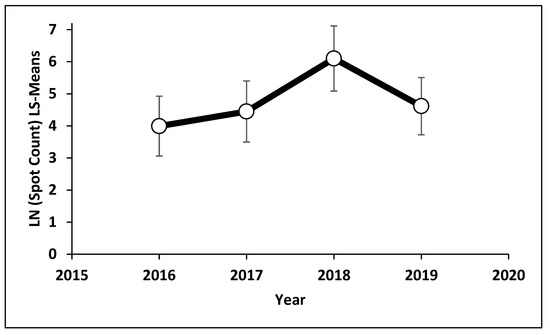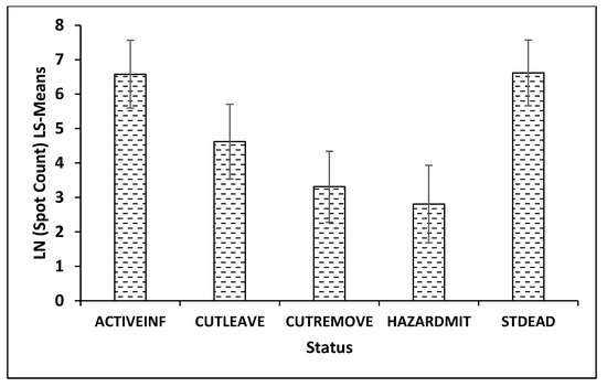 The difference observed between Years (p = 0.0519) could be best described as moderate, where 2018 was greater than the others (Figure 3). Highly significant differences were concluded to be present between statuses (p = 0.0002). Actively infested spots and those occupied by standing dead trees were significantly more common than sites where cut-and-remove or hazard mitigation had occurred (Figure 4). Diagnostically, the negative binomial regression model provided good fit. Deviance was 23.33 with 12 degrees of freedom, and overdispersion was minimal ( = 1.94). The Akaike Information Criterion was 249.70, nearly five times below that produced by the Poisson regression model, where lower is better [29].