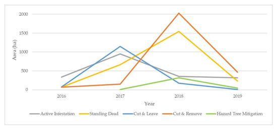 The manual interpretation of imagery obtained covering the BNF from 2016–2019 led to the delineation of 5722 discrete spots over the four-year period. The total impact of the outbreak (including all categories) over the four year period was 8955 ha (approximately 12% of the BNF). The total area treated (i.e., cut-and-leave, cut-and-remove, or hazard tree mitigation) over the course of the outbreak was 4488.1 ha. At the onset of the outbreak, through the first year of assessment (2016), active infestation acreage was greater relative to treatment as the BNF began to suppress some of the numerous and enlarging infestations. Based on the interpretation of the imagery, from 2016 into 2017, the acreage actively infested nearly tripled from 337.1 ha to 952.6 ha. Coincident with the infestation increasing and peaking in 2017 (in terms of area actively infested), was the acreage treated. Areas actively infested and those occupied by standing dead timber totaled approximately 405 ha in 2016. This increased to an estimated 1618.7 ha in 2017. However, the area treated by the cut-and-leave method was 1149.3 ha. Combined with limited cut-and-remove operations, the total area treated in 2017 is approximately 1295 ha. This roughly matched the total area actively infested in 2016 and 2017 (1290 ha actively infested between the two years vs. 1303.5 ha treated in 2017).
