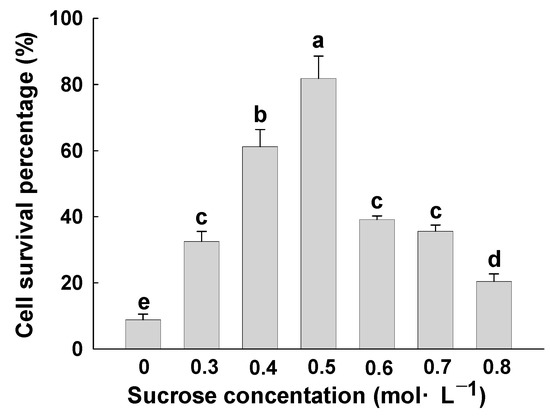 - Sucrose concentration selection: 1.0 g of EC was inoculated on solid WPM with different concentrations of sucrose (0, 0.3, 0.4, 0.5, 0.6, 0.7 and 0.8 mol·L−1). It was cultured in the dark at 25 °C for 1 d. The pre-cultured EC was added to a 1.8 mL cooling tube, along with the loading solution (2 mol·L−1 glycerol + 0.4 mol·L−1 sucrose + liquid WPM), and treated at room temperature for 40 min. Afterward, the loading solution was removed, and 2 mL of plant vitrification solution 2 (PVS2) was added (30% glycerol + 15% DMSO + 15% ethylene glycol + 0.4 mol·L−1 sucrose + liquid WPM). It was dehydrated in the ice water mixture for 40 min, then added to the cooling tube, which was kept in liquid nitrogen immediately. It was then rewarmed for 2 min at 40 °C water bath after 2 h. After rapid removal of PVS2, it was washed 4 times with loading solution in the horizontal flow clean bench, at intervals of 10–15 min. Finally, the EC was evenly dispersed on the filter paper, and the excess water was absorbed with a pipette and transferred to WPM for dark culture at 25 °C. After 24 h, the relative survival percentage of cells was calculated.