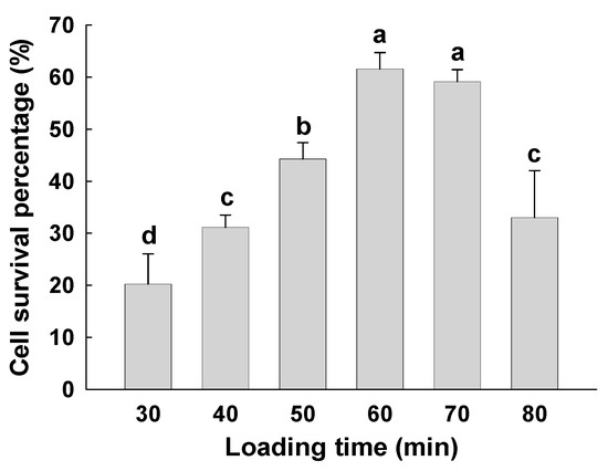 - Loading time selection: The loading time (30, 40, 50, 60, 70 and 80 min) was determined by the treatments with higher cell relative survival percentage in pre-cultured sucrose concentration and time. The relative survival percentage of cells was detected after dehydration, cooling, rewarming and washing for 24 h.