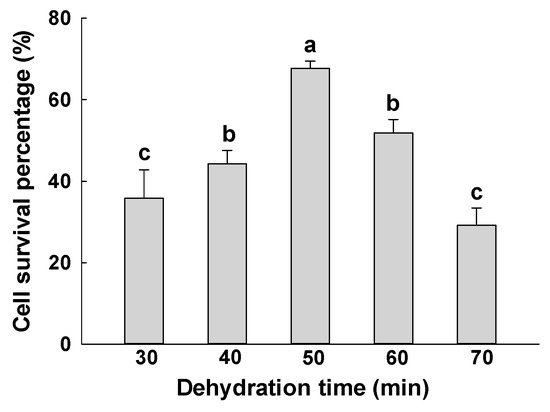 - Dehydration time selection: Vitrification dehydration time was screened based on the highest relative survival percentage in pre-culture and loading time treatment. A total of 2 mL of PVS2 (30% glycerol + 15% DMSO + 15% ethylene glycol + 0.4 mol·L−1 sucrose + liquid WPM) was added to the EC mixture, and the dehydration times were 30, 40, 50, 60 and 70 min. We then compared the effects of different dehydration times on the cell relative survival percentage after cryopreservation of F. mandshurica EC after vitrification.