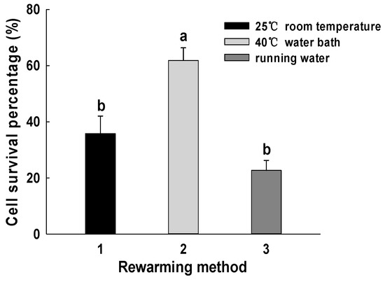 - Rewarming method selection: The different rewarming methods (25 °C room temperature, 40 °C water bath and running water washing) were determined by the treatment with the highest cell survival percentage with sucrose concentration, pre-culture time, loading time and dehydration time. We then compared the effects of different rewarming methods on the cell relative survival percentage after cryopreservation of F. mandshurica EC after vitrification.