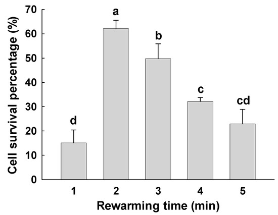 - Rewarming time selection: Based on the abovementioned experiments, the rewarming time (1, 2, 3, 4 and 5 min) was determined. Then the loading solution was washed for 24 h, and the cell survival percentage was detected.