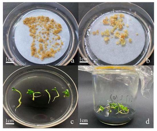 - Recovery culture of EC after resuscitation was based on the Yu et al. [15] recovery culture method for EC of F. mandshurica. Specific methods: After cryopreservation and resuscitation by vitrification, the EC of F. mandshurica was restored in WPM with 0.1 mg·L−1 6-BA and 0.15 mg·L−1 2,4-D. Subculture multiplication was carried out after 15–20 d. Differentiation culture was performed on ½MS with 1.0 mg·L−1 6-BA medium. Then, it was mature cultured on ½MS with 1.0 mg·L−1 ABA medium. Germination and rooting culture was performed on ⅓MS medium with 0.01 mg·L−1 NAA medium, and the images were taken.