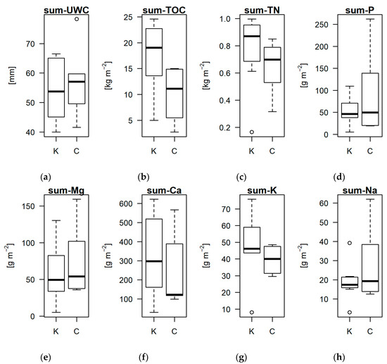 - Vesterdal, L.; Schmidt, I.; Callesen, I.; Nilsson, L.; Gundersen, P. Carbon and Nitrogen in Forest Floor and Mineral Soil under Six Common European Tree Species. For. Ecol. Manag. 2008, 255, 35–48. [Google Scholar] [CrossRef]
