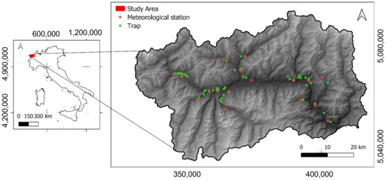 Of the total 277 traps placed for monitoring, only 63 (in 2016) and 75 (for each year from 2017 to 2020) were selected, for a total of 363 traps in the five-year period (2016–2020). We only analyzed traps for which data from meteorological stations were available within a maximum distance of 3.5 km and a maximum difference in altitude of about ± 250 m (Figure 1).