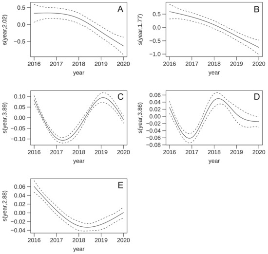 - Wood, S.N. Generalized Additive Models: An Introduction with R, 2nd ed.; Chapman and Hall: London, UK; CRC Press: Boca Raton, FL, USA, 2017. [Google Scholar]