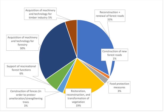 From Figure 1, it is clear that the largest part of the RDP CZ “forestry budget” was intended for the reconstruction and renewal of forest roads and, subsequently, for the acquisition of machinery and technology designed for forestry. A significant part (almost one fifth) is also occupied by the restoration, reconstruction, and transformation of vegetation. The other categories are rather comparable (5% or less from the budget).