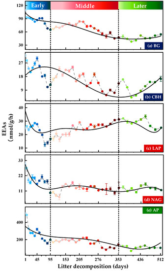 Previous meta-analyses showed that the ratio of different EEAs (BG, NAG, LAP, and AP) to SOC was close to 1.0 [14]. However, the absolute values of the slopes between EEA and SOC in the present study ranged from 0.06 to 2.00 (Figure 3a). This suggests the extreme imbalance between the availability of substrate resources and the microbial metabolic demands. Soil microbial communities are able to access limited resources from complex substrates by secreting specific extracellular enzymes, resulting in a high degree of flexibility in soil enzyme stoichiometry [62]. Soil microbes respond to metabolic C- and P-limitations by secreting C-enzymes (C/N enzyme > 1) and P-enzymes (N/P enzyme < 1; Figure 2), which respond to target resource imbalances through EEAs to maintain microbial homeostasis [15,60]. The decrease in C/N-enzyme and MBN/MBP and the increase in C/P-enzyme and N/P-enzyme (Figure 2 and Table S2) indicated that soil microbial demand for N gradually increased during the transformation of plant residues, which corresponded to the trend of increasing LAP enzyme activity. In addition, Mori et al. [63] presented new findings on substrates resource allocation, which suggested that the declining C/N-enzymes do not represent the utilization of C and N resources by soil microorganisms, but can be used to determine the source of C acquisition by soil microorganisms (plant-derived or microbial-derived). Soil microbes can acquire C sources by secreting N-enzymes to degrade N-containing compounds, e.g., lignin-embedded protein and N-rich microbial necromass [53,64]. This microbial metabolic process not only provides N sources but also alleviates microbial C-limitation.