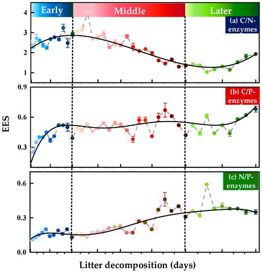 According to the correlation between soil EES and substrate stoichiometry, soil microbial biomass and its stoichiometry significantly influenced extracellular enzymes and their stoichiometry (Figure 7 and Table 2). Because microbial biomass is the labile part of organic matter, it is more sensitive than chemical properties to respond to the transformation processes of plant residual C [65]. MBC explained the highest percentages of EEAs and EES among many factors (Figure 6b and Figure 7b). This is attributed to the fact that MBC is the available and preferred energy utilized by soil microorganisms, which is the driving force for organic matter decomposition [66]. Unlike the available part, soil microorganisms first converted recalcitrant C fractions into labile ones via the ex vivo modification pathway (EEAs’ action), and then further transformed to the microbial biomass via the in vivo turnover pathway [10], which is invoked in case microbial metabolic limitation occurs [67,68]. The active substrates decreased with the transformation of plant residues, forcing some microorganisms to dormancy or intracellular element mineralization. As a result, microbial biomass (MBC, MBN, and MBP) decreased throughout decomposition (Table S2). In addition, microbial biomass stoichiometry changes may be related to the shift in microbial community structure [69], which could affect enzymatic stoichiometry as well. In summary, the present results indicated that soil microbial biomass stoichiometry and, in particular, the influence of MBC are most prominent for soil extracellular enzyme activity and its stoichiometric variation than other factors.