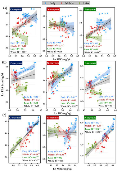 C- and P-enzymes were significantly and positively correlated with SOC throughout the decomposition of plant residues (Figure 3a), especially in the middle stage. C-, N-, and P-acquired EEAs were all significantly and positively correlated with DC in the early stage of plant residue decomposition (Figure 3b). Moreover, C- and P-enzymes showed a significant positive correlation with MBC at all observed stages (Figure 3c). N-enzymes significantly and positively correlated with MBC in the early stages of decomposition but not in other stages.