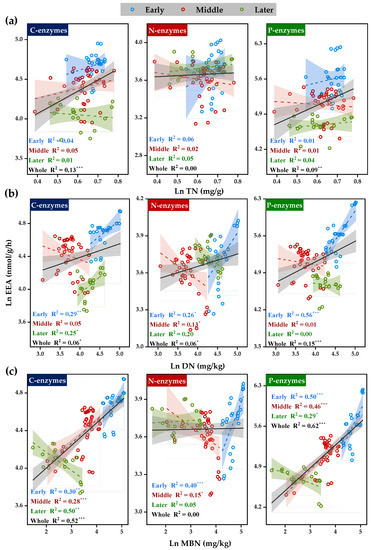 C-, N-, and P-acquiring EEAs were insignificantly correlated with TN at early, middle and late stages of plant residue decomposition (Figure 4a). However, both C-, N-, and P-enzymes showed a significant positive correlation with DN in the early stage (Figure 4b). Furthermore, C- and P-enzymes were positively correlated with MBN in the early and middle stages while negatively correlated with MBN in the later stages (Figure 4c).